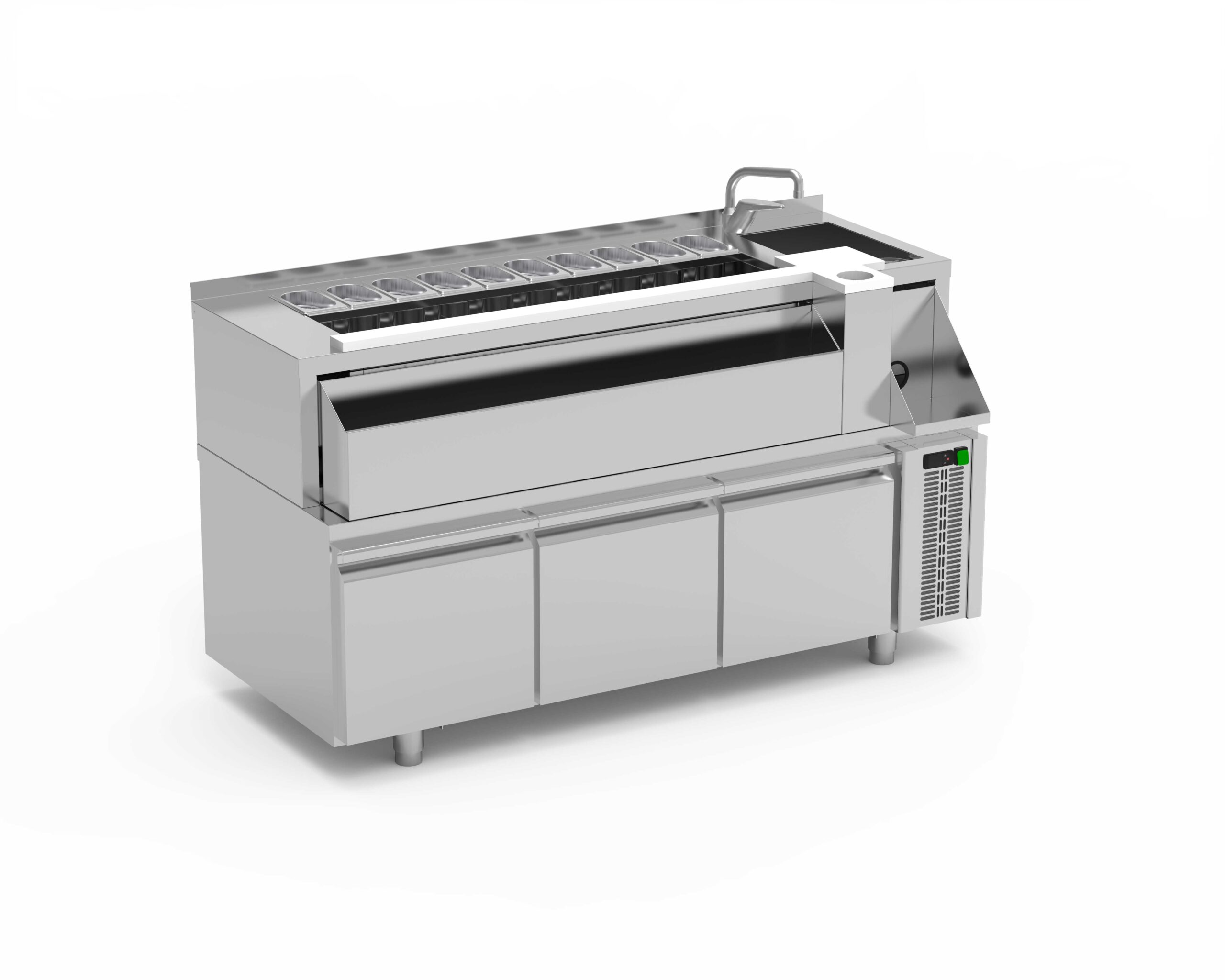 - Cuba aislada con separadores movibles y fondo perforado para mantener los ingredientes frescos.