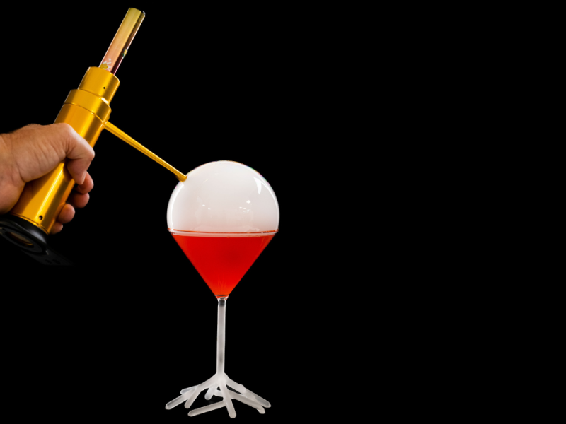 Las pompas se elaboran con la solución BUBLER , apta para alimentación. Bubbler es una solución extremadamente estable, que con apenas un par de gotas puede generar una pompa en su bebida o plato rellena de vapor color blanco y extremadamente aromático. Puede escoger entre los 11 sabores estándar o utilizar su VAP rellenable y rellenar con soluciones para los vapeadores sin nicotina.