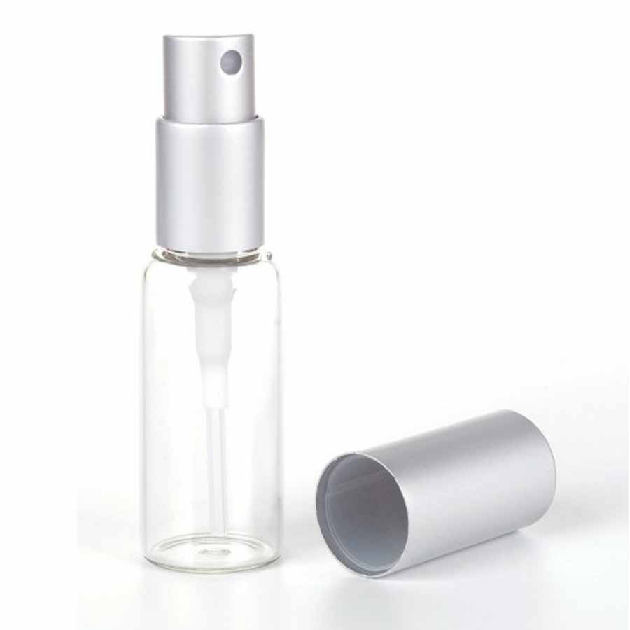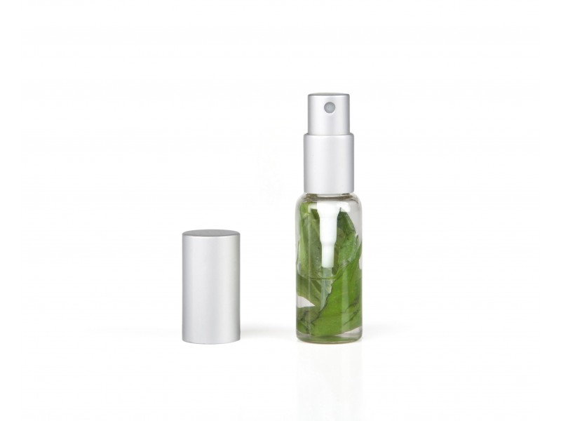 Mini Spray vaporizador de cristal rellenable. Su vaporizador enroscable permite lavar y rellenar la botella con suma facilidad. Presentación de perfumería con tapón metálico color plata.