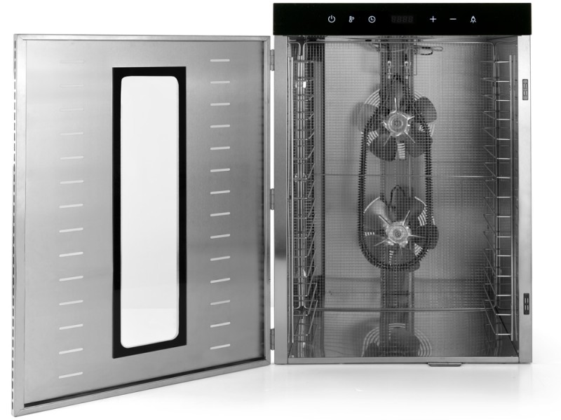 Las bandejas son regulables en altura y permiten fermentar lácticos como yogurt, desecar todo tipo de frutas vegetales y especias para decorar y elaborar polvos. Trabajos con azúcar, claras, obulato®, secado de carnes y pescados, elaboración de hojas enteras, o bien pequeñas formas realizadas con Krokanters®. Al deshidratar por encima de los 75°C permite trabajar también con ovo-productos.