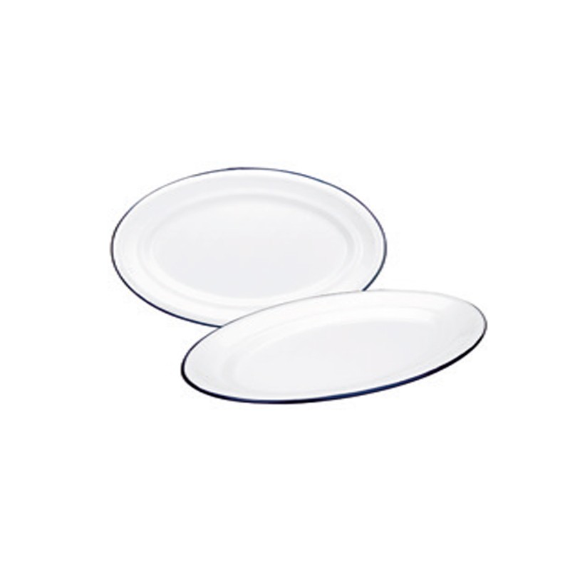 Plato ovalado 25 cm acero esmaltado vitrificado con borde azul.